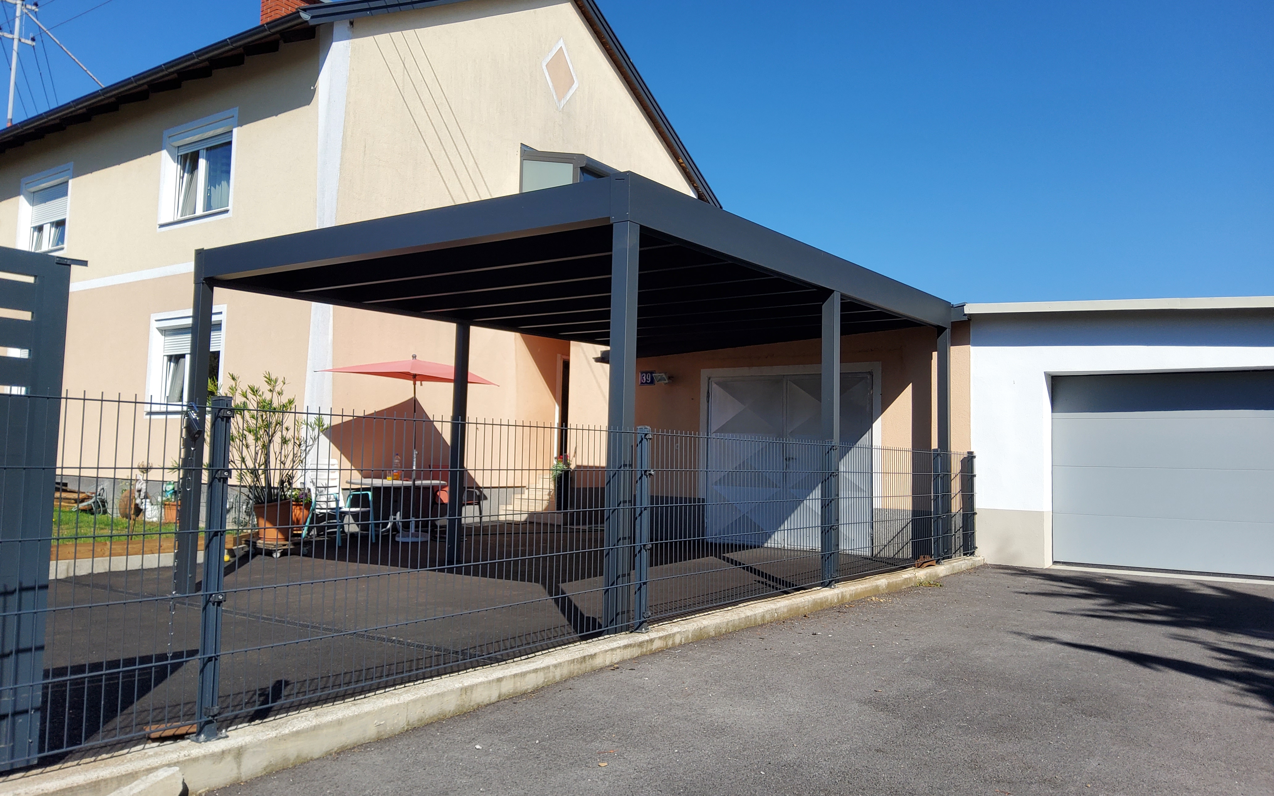 Im Gegensatz zur geschlossenen Garage bleibt der Bereich offen und luftig, was eine natürliche Belüftung ermöglicht und Staunässe am Fahrzeug verhindert.